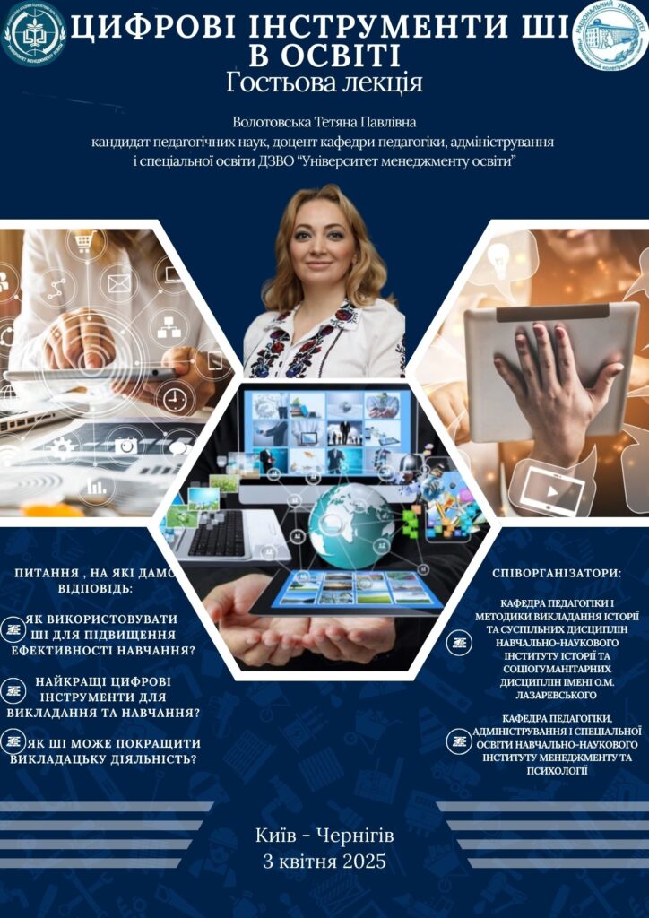 Тетяна Павлівна Волотовська, кандидат педагогічних наук, доцент кафедри педагогіки, адміністрування і спеціальної освіти ДЗВО «Університет менеджменту освіти» 3 квітня 2025 року провела гостьову лекцію на тему «Цифрові інструменти ШІ в освіті» для аспірантів і викладачів ННІ історії та соціогуманітарних дисциплін імені О. М. Лазаревського. Вона звернула увагу на актуальні питання використання ШІ для підвищення ефективності навчання й удосконалення викладацької діяльності та схарактеризувала найкращі цифрові інструменти для навчання. У рамках співпраці між ЗВО на лекції були присутні представники Університету менеджменту освіти (м. Київ) і Житомирського державного університету імені Івана Франка. Лекція викликала неабиякий інтерес здобувачів і викладачів. Окрім цього, було ухвалено рішення про подальшу співпрацю між ЗВО та перспективи створення Асоціації аспірантур Національного університету «Чернігівський колегіум» імені Т.Г. Шевченка, Університету менеджменту освіти та Житомирського державного університету імені Івана Франка.